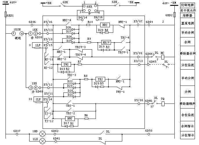 +KM → X5/16 → TBJ-1(TBJ-2)→ X5/08 → TQ線圈 → -KM,從而啟動斷路器跳閘線圈TQ,實現(xiàn)了手動跳閘。