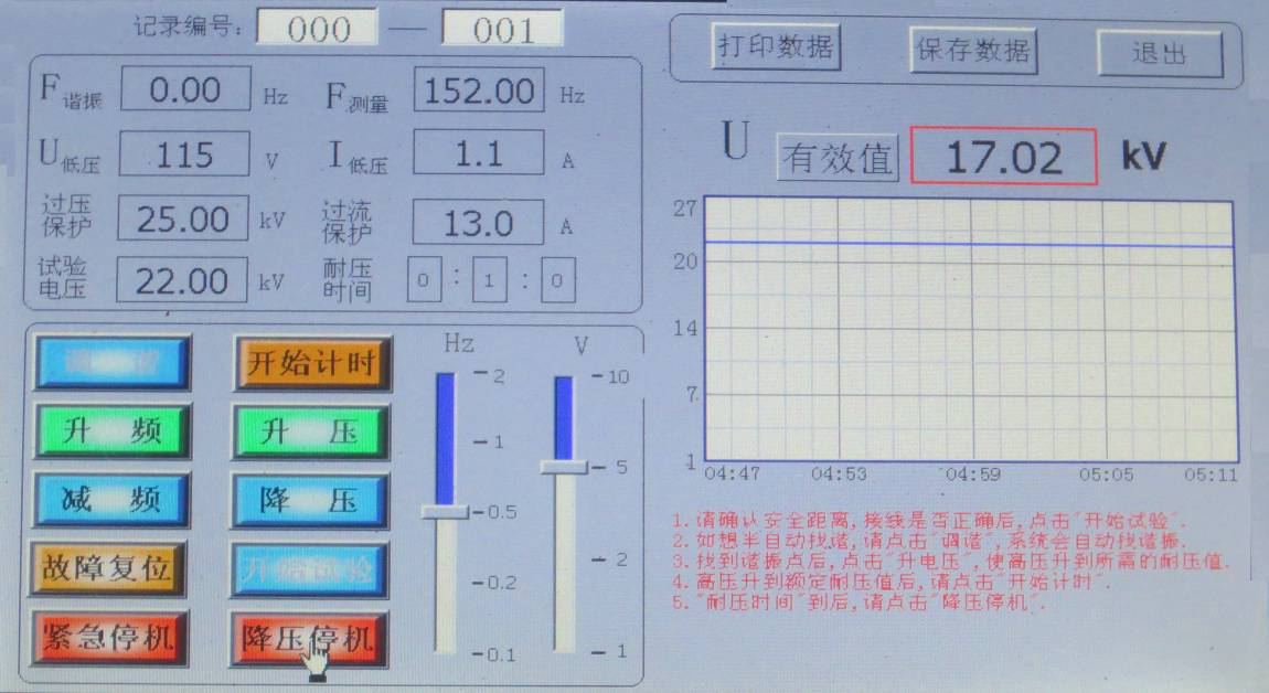 當U諧振電壓降壓0時,試驗完成,如想查詢試驗記錄,請在降壓前點擊保存數(shù)據(jù),降壓后點擊“文件管理”; 顯示界面如圖所示。