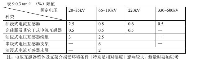 1.互感器的繞組 tanδ測量電壓應在 10kV 測量,tanδ不應大于表 9.0.3 中數(shù)據(jù)。當對絕緣有懷疑時,可采用高壓法進行試驗,在(0.5~1) Um√3 范圍內(nèi)進行,tanδ變化量不應大于0.2% ,電容變化量不應大于0.5%;