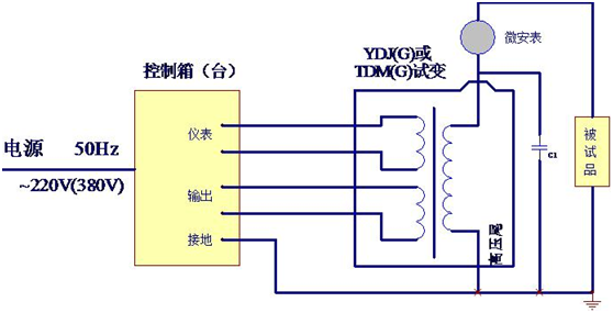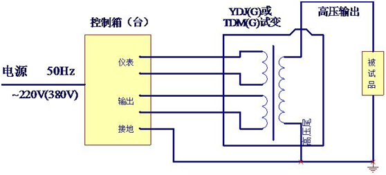 油浸式試驗(yàn)變壓器交流(工頻)耐壓試驗(yàn)接線示意圖