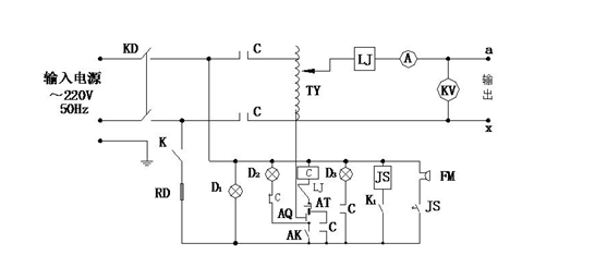 其中JS:時(shí)間繼電器 TY:自藕調(diào)壓器 FM:報(bào)警器 LJ:過流繼電器 D1、D2、D3:指示燈 C:交流接觸器 RD:熔斷器 K:總電源開關(guān) K1:時(shí)間繼電器電源開關(guān) AK:調(diào)壓器回零限位開關(guān) AQ:起動按鈕 CL:高壓硅堆 AT:停止按鈕 A:輸出電流表 KV:輸出電壓表