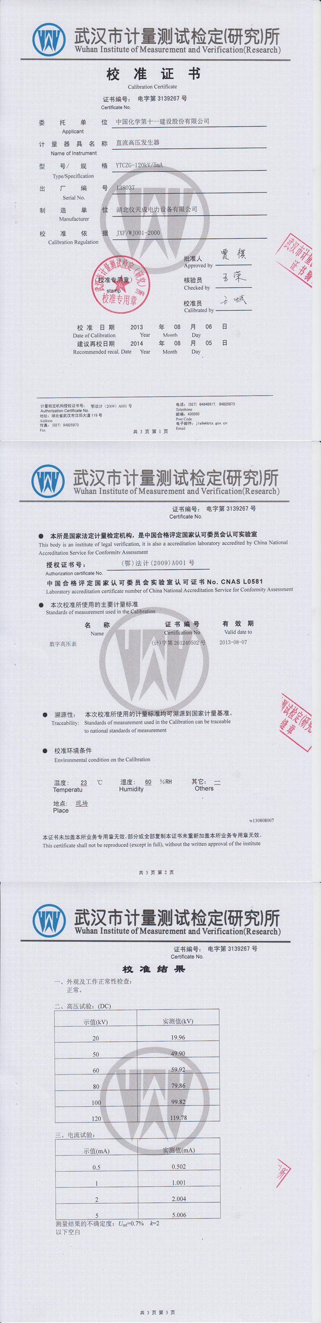 轉(zhuǎn)載:"YTCZG-120kV/2mA直流高壓發(fā)生器資質(zhì)證書" 請注明來源于儀天成電力。 更多技術(shù)問題請致電儀天成電力客戶服務(wù):027-87876585,技術(shù)部專線:027-87876585,在線客服:719388481