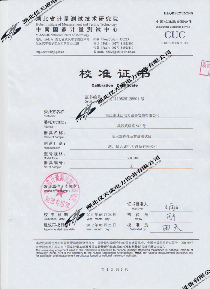 轉(zhuǎn)載:"YTC3100變壓器特性及容量測(cè)試儀的資質(zhì)證書" 請(qǐng)注明來(lái)源于儀天成電力。 更多技術(shù)問(wèn)題請(qǐng)致電儀天成電力客戶服務(wù):027-87876585,技術(shù)部專線:027-87876585,在線客服:719388481