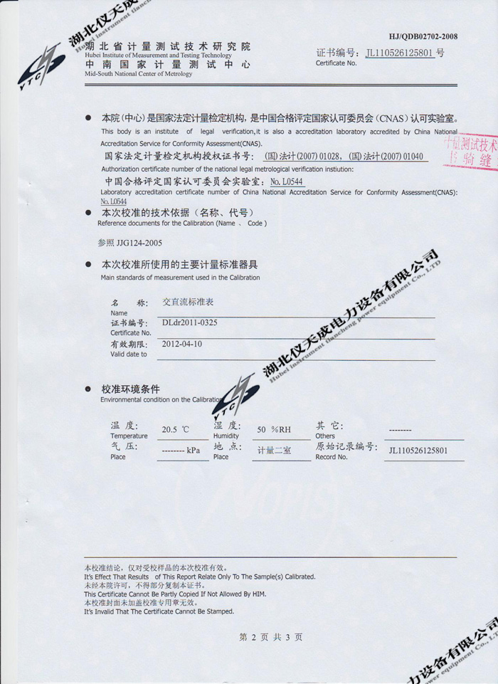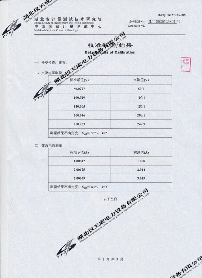 YTC3100變壓器特性及容量測(cè)試儀的資質(zhì)證書
