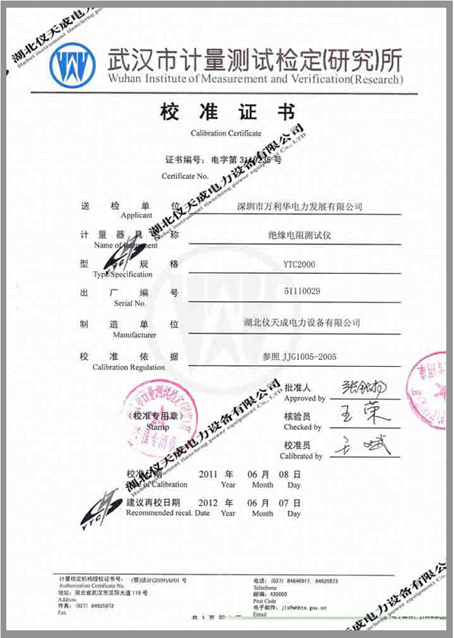 轉(zhuǎn)載:"YTC2000智能雙顯絕緣電阻測試儀鑒定證書" 請注明來源于儀天成電力。 更多技術(shù)問題請致電儀天成電力客戶服務(wù):027-87876585,技術(shù)部專線:027-87876585,在線客服: