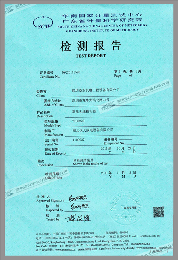 YTC6220高壓無線核相器鑒定證書